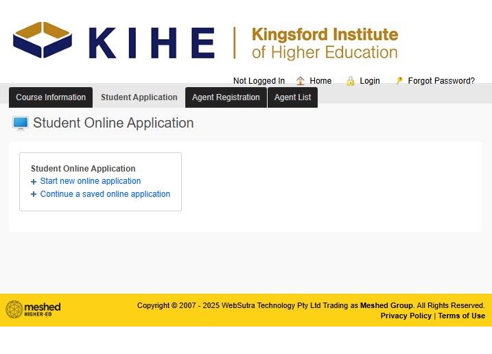 You will be directed to Meshed Higher-Ed Application Page. You do not need an account to apply. Simply click the Start New Application button below to commence your online application.